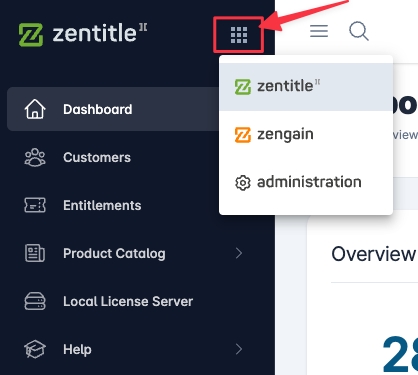 You can select between our applications (Zentitle and Zengain) and the central administration sections.